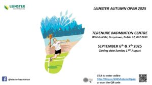 2025 Leinster Autumn Open The 2025 Leinster Autumn Open will be held in Terenure Badminton Centre on the weekend of September 6th and 7th 2025. Click here to enter. Barry2025-07-15T11:34:28+00:00