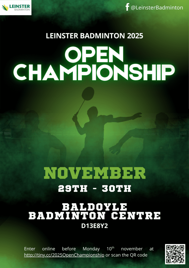 Leinster Open 2025 Entry is now open for the 2025 Leinster Masters Open to be held in Baldoyle Badminton Centre on the weekend of 29th & 30th November. Get your entries in – here Barry2025-10-02T15:37:56+00:00